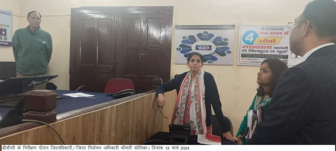 जिलाधिकारी/जिला निर्वाचन अधिकारी सोनिका ने जनमानस से अनुरोध किया निर्वाचन/ वोटर संबंधी समस्या व जानकारी के लिए डीसीसी (कन्ट्रोलरूम) स्थापित किया गया है, कि वे अपनी निर्वाचन सम्बन्धी जानकारी टोल फ्री नंबर 1950 के जरिए ले सकते हैं तथा अपनी समसयाओं का निराकरण करें। निरीक्षण के दौरान मुख्य विकास अधिकारी झरना कमठान, नगर मजिस्ट्रेट प्रत्युष सिंह सहायक निदेशक सूचना बी.सी नेगी आदि उपस्थित रहे।