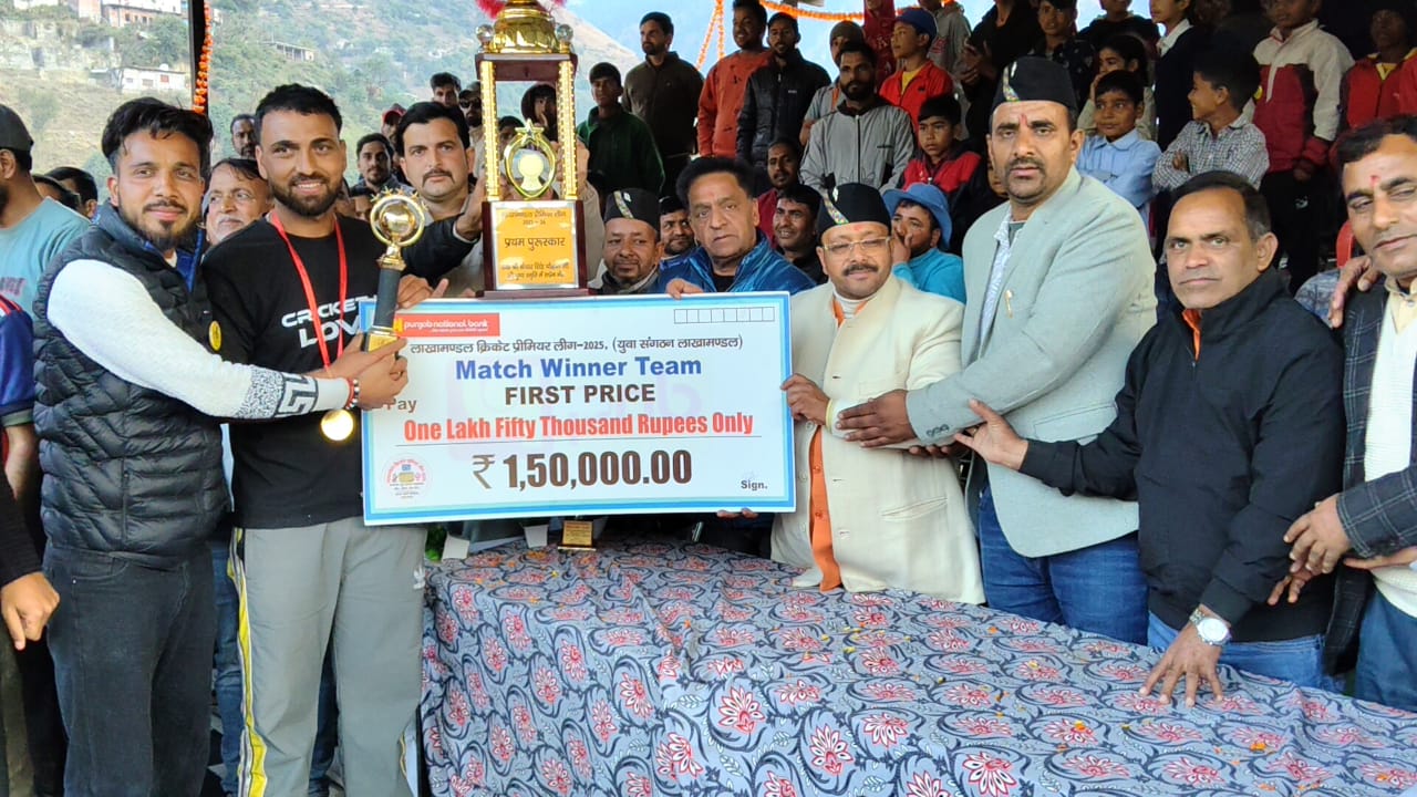 जनपद देहरादून ब्लाक चकराता के युवा संगठन लाखामंडल द्वारा आयोजित पहाड़ी दिवाली धमाका लाखामंडल प्रीमीयर लीग 2025 मिनी स्टेडियम सेरा ग्राउंड लाखामंडल क्रिकेट टूर्नामेंट का आज विधिवत समापन हुआ। जिसमें लगभग यमुना घाटी क्षेत्र से 60 टीमों ने प्रतिभाग किया।आपको बताते चलें युवा संगठन लाखामंडल द्वारा 13/11/25 से 9/12/25 तक चलें क्रिकेट टूर्नामेंट का फाइनल मैच लाखामंडल की दोनों टीमो के बिच कड़ा मुकाबला हुआ। शिव क्लब लाखामंडल ने टास जीतकर 10 ओवर में 108 रनों का लक्ष्य रखा था जिसमें कि भैरव क्लब लाखामंडल विजेता टीम ने 6. 3 ओवर में 1 विकेट के नुकसान पर लक्ष्य हासिल किया। उपविजेता टीम शिव क्लब लाखामंडल रही। विजेता टीम के कप्तान पंकज शर्मा डिकोक ने शानदार बल्लेबाजी करते हुए 20 बाल पर 66 रन की पारी खेलते हुए मैन ऑफ द मैच. मैन ऑफ द सीरीज अपने नाम किया। समापन समारोह में मुख्य अतिथि गीताराम गौड़ जनजाति सलाहकार परिषद राज्यमंत्री ने विजेता टीम को 150000 से नगद धनराशि तथा एक ट्राफी 11 मैडल से सम्मानित किया। तथा उपविजेता टीम को 75000 हजार रुपए नकद व एक ट्राफी 11 मेडल से सम्मानित किया। इस अवसर पर सरदार चौहान एस टी आयोग सदस्य। क्वासी मण्अडलध्यक्ष प्रितम चौहान, भाजपा के वरिष्ठ नेता सुरवीर डोभाल,बाबूराम शर्मा, मोहन लाल बहुगुणा स्याणा, सुरेन्द्र शर्मा, खुशीराम गौड़, बिपिन चौहान, सौरभ राणा,टीकाराम बहुगुणा,जगतराम शर्मा,बूटाराम गौड़, उत्तमचंद गौड़, अंतर दत्त बहुगुणा, श्याम दत्त,ओमप्रकाश बहुगुणा, विनोद रावत, विरेन्द्र भट्ट, आदि उपस्थित थे।