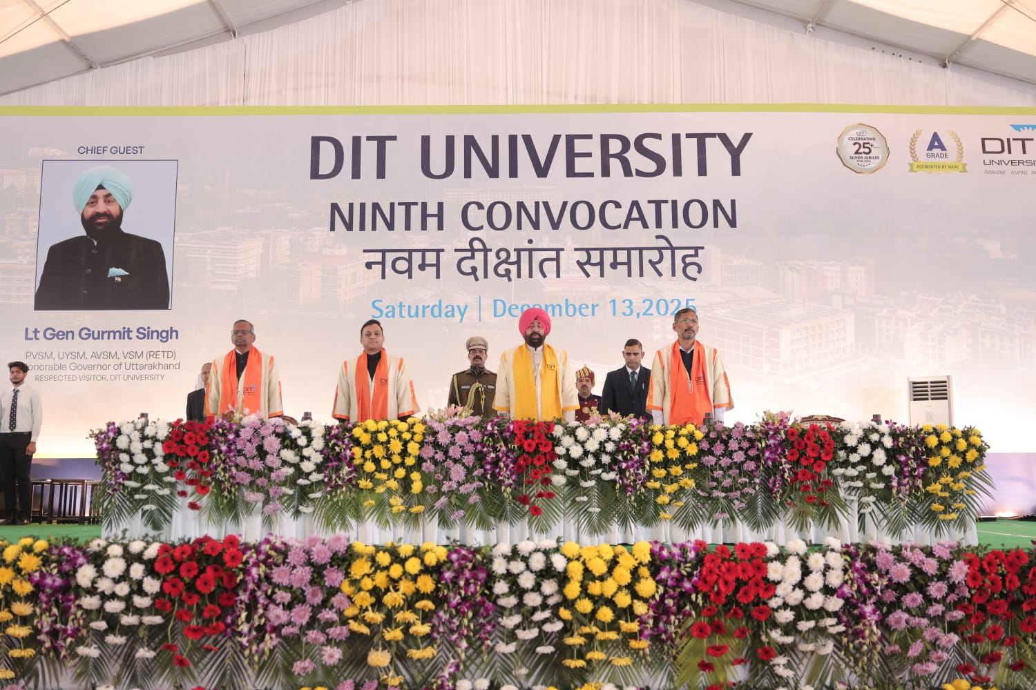 देहरादून। डीआईटी विश्वविद्यालय, देहरादून का 9वां दीक्षांत समारोह शनिवार को डीआईटी परिसर में आयोजित किया गया। समारोह की अध्यक्षता उत्तराखंड के माननीय राज्यपाल लेफ्टिनेंट जनरल (सेवानिवृत्त) गुरमीत सिंह ने की। इस अवसर पर डीआईटी विश्वविद्यालय के अध्यक्ष अनुज अग्रवाल, प्रधान सलाहकार एन. रविशंकर (आईएएस, सेवानिवृत्त), कुलपति प्रो. जी. रघुरामा, बोर्ड ऑफ गवर्नर्स, बोर्ड ऑफ मैनेजमेंट तथा एकेडमिक काउंसिल के सदस्यगण गरिमामयी उपस्थिति में उपस्थित रहे।